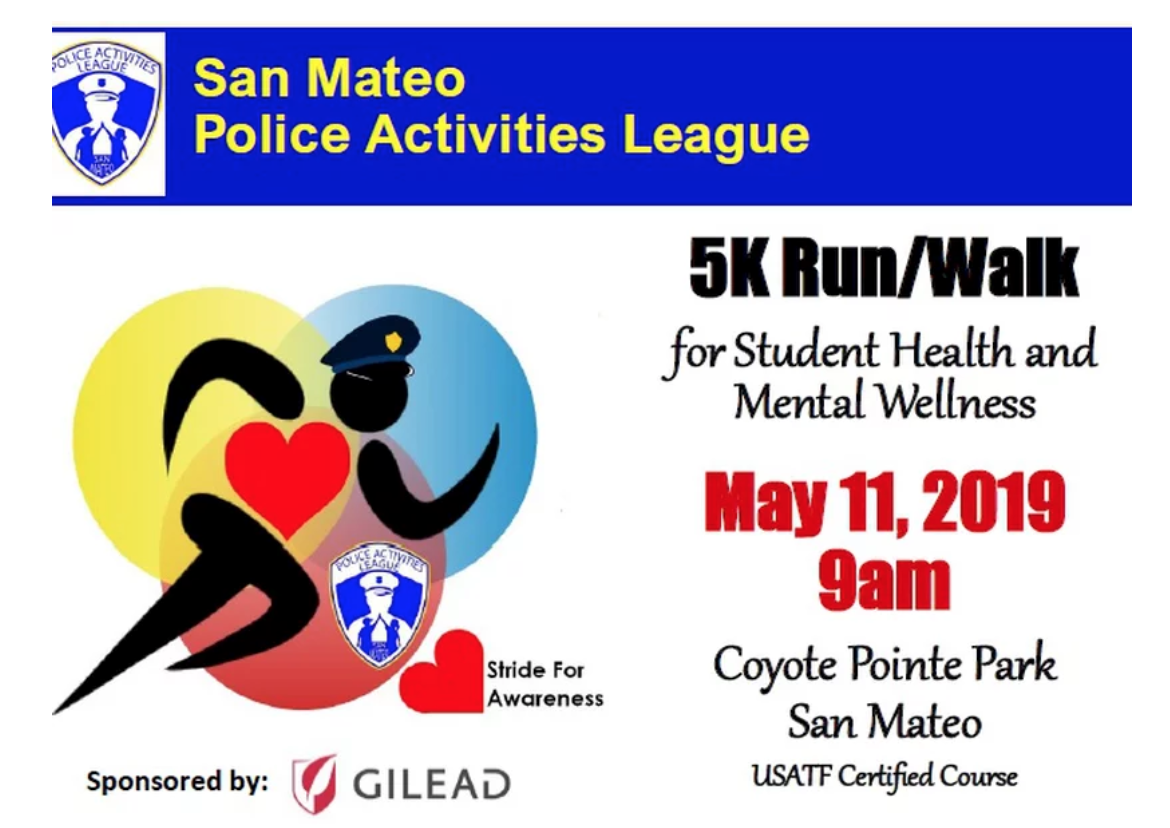 San Mateo Police Activities League is hosting a 5k Run/Walk on May 11th at 9am at Coyote Point Park through Stride for Awareness to raise awareness for student health and mental wellness.