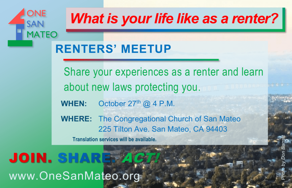 Sunday, October 27, One San Mateo will host a special renter meet-up to be held at the Congregational Church of San Mateo from 4 to 6 pm. A primary purpose of the meet-up will be to inform renters about AB 1482, the new statewide renter protection law that was just signed into law by Governor Newsom on October 8.