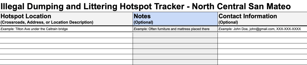 Know of somewhere in North Central that regularly has litter or large dumped items? Add that location to our tracker so the San Mateo Public Works Department knows to service that place and report it for immediate cleanup by Public Works here.