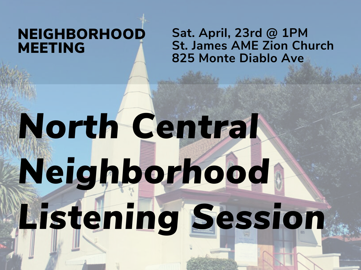 North Central residents and homeowners you are warmly invited to a neighborhood listening session on Saturday April 23rd at 1pm at St. James Zion Church.
